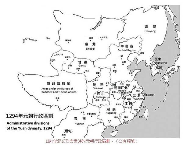1294年忽必烈去世時的元朝行政區劃。(公有領域)