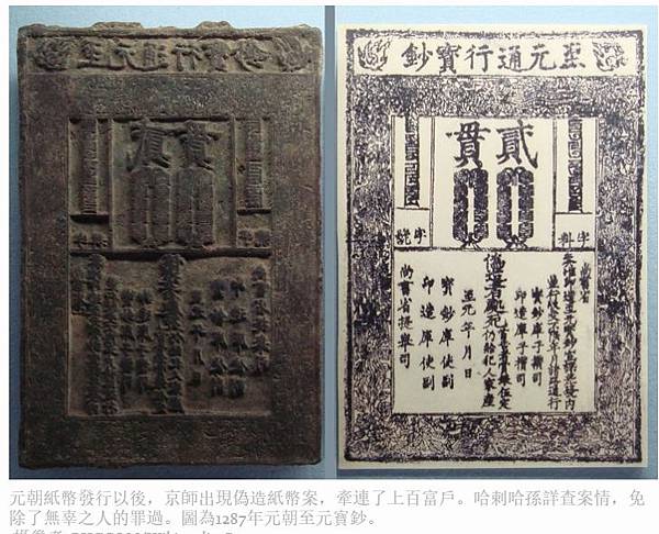 元朝紙幣發行以後,京師出現偽造紙幣案,牽連了上百富戶。哈剌哈孫詳查案情,免除了無辜之人的罪過。圖為1287年元朝至元寳鈔。(PHGCOM/Wikimedia Commons)