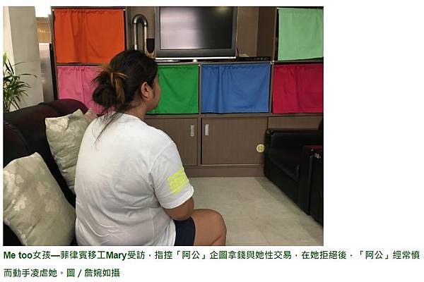 Me too女孩—菲律賓移工Mary受訪,指控「阿公」企圖拿錢與她性交易,在她拒絕後,「阿公」經常憤而動手凌虐她。圖/詹婉如攝