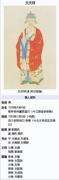 文天祥(1236年6月6日-1283年1月9日),南宋末期官員、抗元英雄。南宋末期吉州廬陵富川(今江西吉安縣)人,漢族江右民系,初名雲孫,字天祥。選中貢士後,換以天祥為名,改字履善。寶祐四年(1256年)在殿試中被宋理宗拔為第一後(狀元),後再改字宋瑞,後因住過文山,而號文山。在宋朝最後被封為信國公。