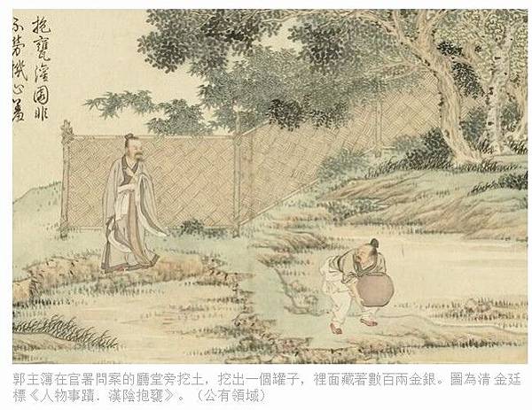 郭主簿在官署問案的廳堂旁挖土,挖出一個罐子,裡面藏著數百兩金銀。圖為清 金廷標《人物事蹟.漢陰抱甕》。(公有領域)
