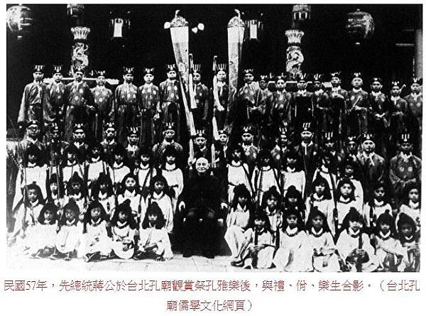 1968年時蔣介石至台北孔廟觀賞祭孔雅樂,典禮結束後與與禮、佾、樂生合影並說道:看了祀孔典禮以後,愈益感覺到禮樂的感人之深:禮樂不但可以修己淑世,合敬同方,亦且就在看到了那種和諧的動作,聽到了那種典雅的音節,即足以鼓舞踔厲,相觀而善,所以各級學校,以後要特別重視禮樂對於學生的涵濡指導。