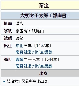秦金,明兩京五部尚書,字國聲,號鳳山,明成化三年(1467年)九月十一日生,常州府無錫縣。秦金自幼在家塾讀書,成化二十二年中舉人,弘治六年(1493年)中進士。時稱他為“兩京五部尚書,九轉三朝太保”。據秦氏宗譜所述,秦金為宋龍圖閣大學士秦觀之後。