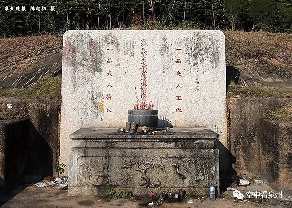 墓碑上刻字,中為:皇清光祿大夫太子少傅靖海將軍襄壯施公賜塋;兩側刻字為:一品夫人王氏,一品夫人黃氏。襄壯,是施琅的諡號。墓碑規格很高,大而厚,彰顯了墓主人身份的尊貴和受到欽賜祭葬的榮耀。