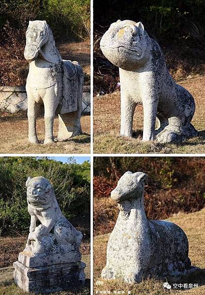 墳包左前方和右前方,依次立有文武翁仲四尊,馬、虎、獅、羊各一對。