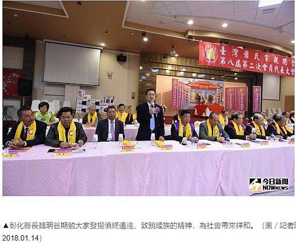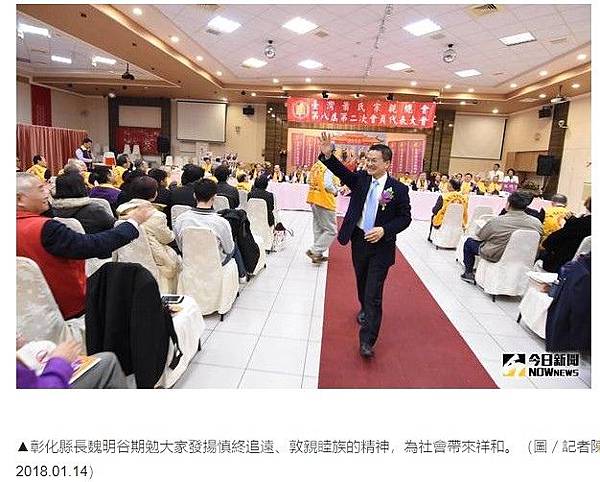 台灣蕭氏宗親總會舉行第八屆第二次會員大會,彰化縣長魏明谷期勉大家發揚慎終追遠、敦親睦族的精神,為社會帶來祥和。(圖/記者陳雅芳攝,2018.01.14)