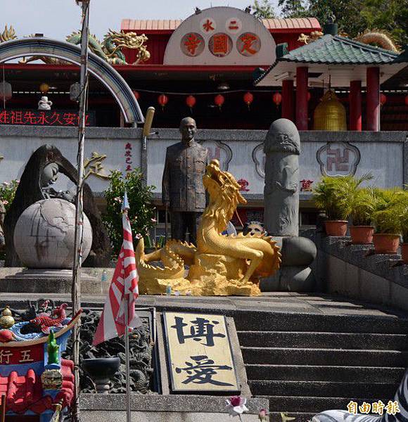 定國寺前有蔣介石銅像,旁邊還有民眾捐獻的擺飾。(記者顏宏駿攝)
