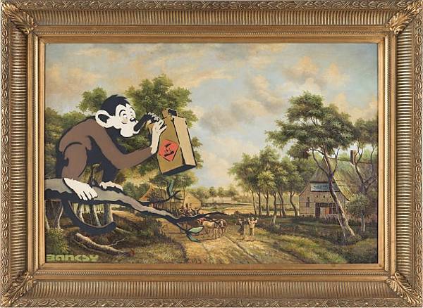 班克西(Banksy)作品《猴子毒藥》(Monkey Poison)創作於2004年,該幅畫的背景是複製的古典畫作,描繪田園風光,畫作左下角則是班克西作品裡常見的黑猩猩,牠拿著一罐汽油大口喝著。
