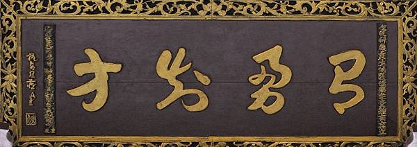 內容說明: 「有勇知方」匾是歲貢生候選儒學正堂鍾有容於明治四十二年(1909)所立。此匾為新埔褒忠亭僅有的草體匾額。