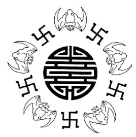 正面以纍絲作地紋。首面中央鑲一珠花,五片花瓣為碧璽鑲成,上下左右鑲紅、黃寶石各二顆,邊鑲中型珍珠十六顆,並以松石鑲成枝葉。柄中央及尾端的珠寶鑲花大致與首面相同,唯中央多二側面之碧璽珠花。下垂黃色絲帶編花雙穗。邊側為纍絲迴紋,背飾纍絲蝙蝠、祥雲、及萬字圖案。