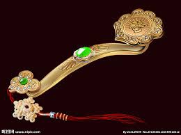 2. 搔背的器具。以骨角、竹木削做人手指爪形,有長柄,可如人心意搔背部的癢,故稱為「如意」。後世演變成一種象徵吉祥的陳設品,以金、玉等刻製,頂端多作靈芝形或雲形,長柄微曲,可供賞玩。