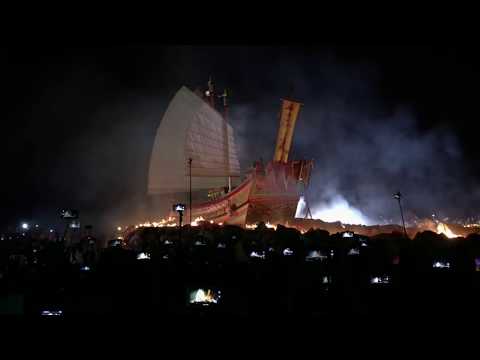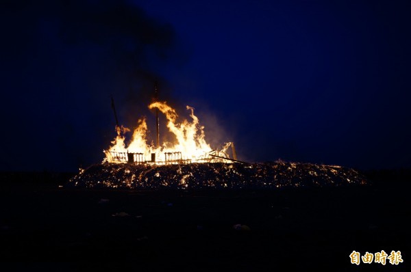 〔記者陳彥廷/屏東報導〕3年1度的「東港迎王平安祭典」是國家無形文化資產,在歷經8天7夜的請水、遶境、王船法會、王船遶境後,今天清晨重頭戲「燒王船」登場,熊熊火舌襲捲船身後,高達31尺9寸的中桅在今晨6點40分朝向西南方傾倒,象徵戊戌正科東港迎王圓滿落幕,王船、旭日與鵬灣大橋輝映,畫面震憾。