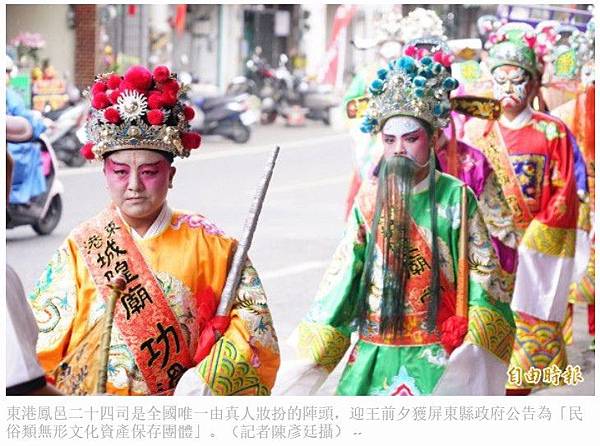 東港鳳邑二十四司是全國唯一由真人妝扮的陣頭,迎王前夕獲屏東縣政府公告為「民俗類無形文化資產保存團體」。(記者陳彥廷攝) --