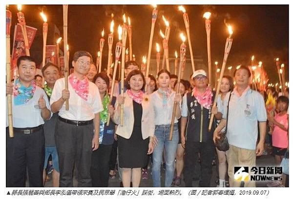 ▲縣長張麗善與鄉長李泓儀帶領來賓及民眾舉「澹仔火」踩街,場面熱烈。(圖/記者郭春輝攝,2019.09.07)