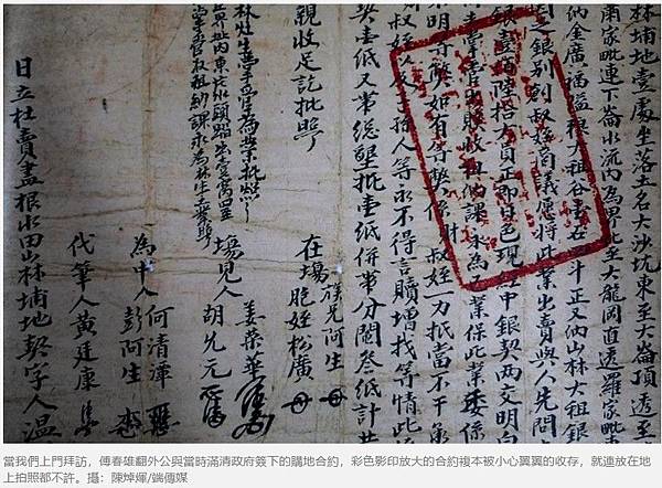 傅春雄翻出同治年間簽下的購地合約,彩色影印放大的合約複本被小心翼翼的收存,就連放在地上拍照都不許。