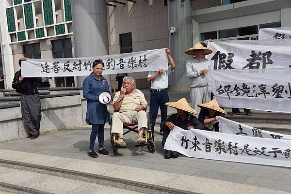 十一月八日,新竹地方法院門外有場記者會,傅春雄坐在輪椅上,背後是一大片抗議的白布條,抗議新竹縣政府的「音樂村」計畫,恐怕會打造出另一座蚊子館。事實上,記者會之所以選在法院前召開,是因為住戶們剛剛出庭應訊,新竹縣政府控告他們「占用公地」,訴請法院判決土地上的住戶「拆屋還地」。