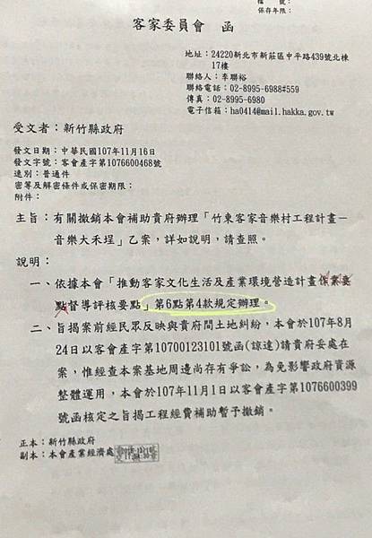 原來上週,縣府因為提告竹東客家音樂村旁傅姓佔用戶,傅男出庭時在庭外手拿白布條抗議,所以客委會認為地方沒有做好民意的溝通,震怒就發公文撤銷已經列入前瞻、中央補助約3.3億的竹東客家音樂村,跟新竹縣說「不做了」。