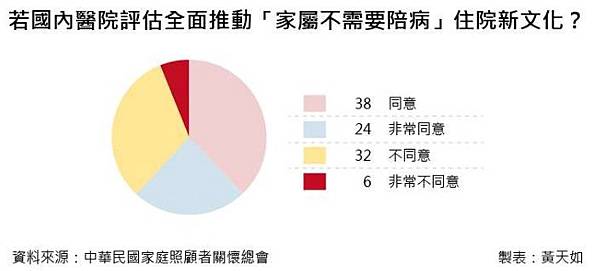 中華民國家庭照顧者關懷總會最新完成的問卷調查便顯示,即使家人住院的醫院有提供全責照護服務,家屬只須每天負擔800-1100元不等,便可與同院病人共聘看護工,仍有少數家屬認為,攸關照顧住院親人這等大事,只要家裡有人手,還是事必躬親比較放心。提到未來政府考慮普及化地推動「家人不需要陪病」的住院新文化,更有38%的國人表示:不同意或非常不同意。