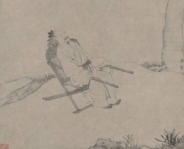這幅圖中,一人悠閒地坐在躺椅上,似乎正在閉目養神。原來在明清時期,人們已經使用攜帶方便,便於休息的舒適躺椅了。