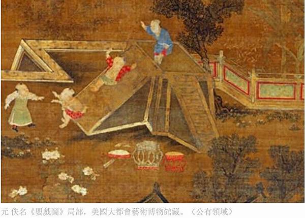 現代的孩童都很喜歡玩滑梯,在古代也不例外呢。美國大都會藝術博物館收藏著一幅元朝繪畫——《嬰戲圖》。