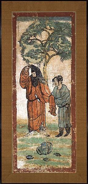 日本東京國立博物館保存著《樹下人物圖》,此畫出土於新疆吐魯番。畫中的女主人,穿的是一雙黑皮靴。(公有領域)