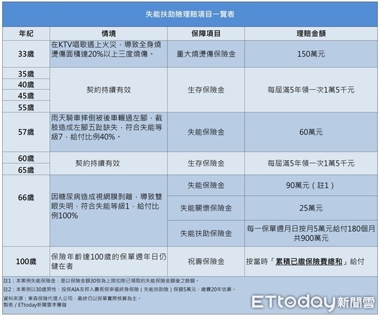 ▲▼東森保代以AIA友邦人壽長保幸福終身保險(失能扶助險)為例,假設一位30歲男性保額5萬元、繳費20年的保單試算各項理賠金。(圖/記者李蕙璇繪製)