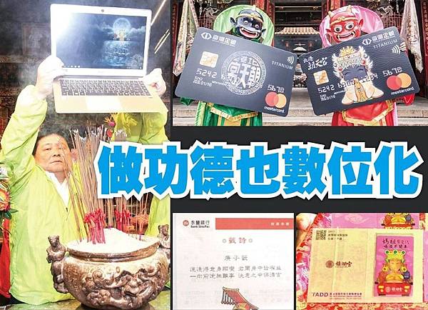 圖左是宏碁大甲媽祈福限定版筆電過爐。圖上為朝天宮媽祖香灰金融卡。圖下為永豐銀行推...