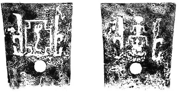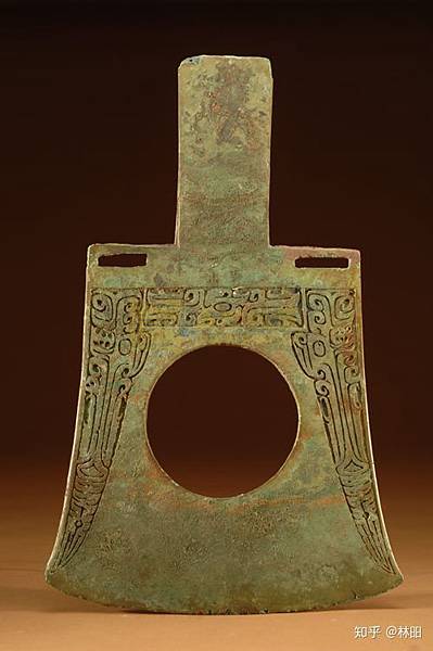 商周時期的青銅器極少只有人頭紋飾而沒有軀體的,而這兩件銅鉞僅透雕有猙獰怪神的頭部,其目的應該是起到一種震懾的作用。類似的青銅鉞在河南西周時期的墓葬中也有發現,收藏家陳仁濤將其解讀為戰神蚩尤紋。
