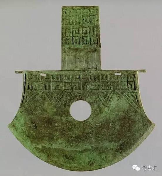說明:《說文》曰:“鉞,大斧也,一名天戉。”鉞即大斧,最早作為兵器,《釋名·釋兵》上曰:“鉞,豁也,所向莫敢當前,豁然破散也。”後來演變為權利的象徵。武王伐紂在牧野誓師,文獻記錄他“左權黃鉞,右秉白旄”,戰勝後,用鉞斬紂王及二妾之頭顱。虢季子白盤同樣有銘“賜用鉞,用徵蠻方。”由此可見,鉞也適用於諸侯和重臣。此青銅鉞較狹,長內,上有小圓孔,肩內兩長條穿。鉞體兩面紋飾相同,肩下三個凸起圓形內有火紋,連接三個蕉葉紋,內以蟬紋填充。刃部闊,兩端有翹起之勢。內上兩面有族徽,一為“亞又”,一為“天黿”。據金文研究,“亞”字銘多是商王朝周邊方國。“天黿”常見於金文,是周人姬姓之祖。郭沫若言之:“天黿二字……器銘多見,舊釋為子孫,余謂當是天黿,即軒轅也。《週語》'我姬姓出自天黿',猶言出自黃帝。 ”推測是商代晚期姬姓周人之物。