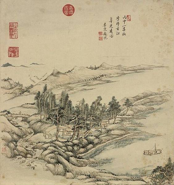 船將要啟航,狗兒跳到船上,銜著秦邦的衣服,秦邦以為狗捨不得自己,於是帶著狗兒一起去京師。圖為清 趙曉畫山水 冊 林屋溪船。(公有領域)