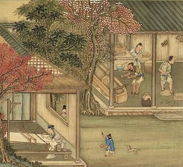 樂妻說:「學習如同織布,應當每日學習一些不懂的,以成就美好的德行;如果棄學而歸,那和切斷這些絲帛有何不同呢?」《御題棉花圖‧織布》。(公有領域)
