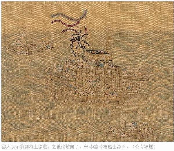 客人表示將到海上環遊,之後就離開了。宋 李嵩《樓船出海》。(公有領域)