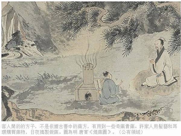 客人開的的方子,不是依據古書中的藥方,有用到一些奇藥貴藥。許家人用髮簪和耳環購買藥物,日夜搗製做藥。圖為明 唐寅《燒藥圖》。(公有領域)