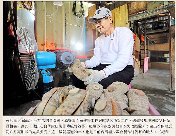 黃奕薰 /65歲。43年次的黃奕薰,原從事寺廟建築工程與雕刻裝潢等工作,偶然發現中國製筊杯品質粗糙,為此,他決心自學鑽研製作傳統竹筊杯,經過多年摸索與數百次失敗經驗,才做出看似農曆初八月亮形狀的完美弧度,這一做就超過20年,也是目前台灣極少數會製作竹筊杯的職人。(記者李惠洲/攝影)