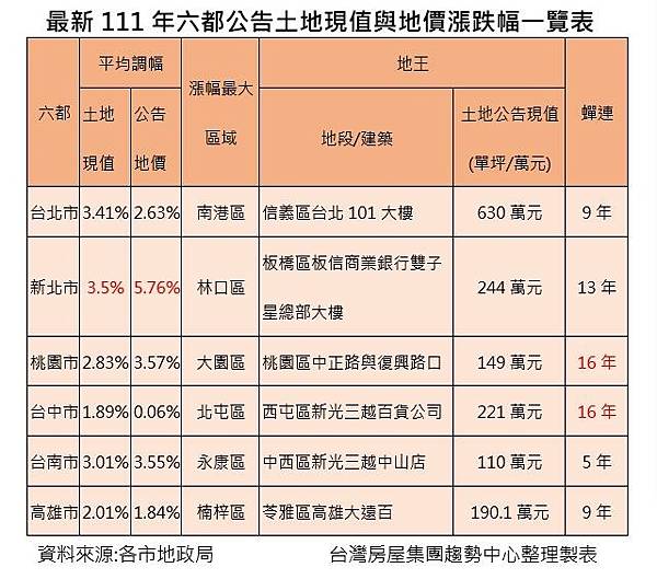 六都地政局最新公布2022年度公告土地現值數據,六都皆呈上漲趨勢,並創下近6年最大漲幅,而去年由桃園漲幅最高奪六都之冠,今年易主,由新北市摘下金牌,平均漲幅3.5%,台北3.41%取得銀牌,六都平均調漲幅度依序如下,新北市上漲約3.5%;台北市調漲3.41%;台南市上漲3.01%;桃園市上漲2.83%;高雄市上漲2.01%;台中上漲1.89%;六都地王部分,若以蟬聯年度來看,桃園與台中次數最多16年之久,可屬長老級地王,其次為新北居次達13年。