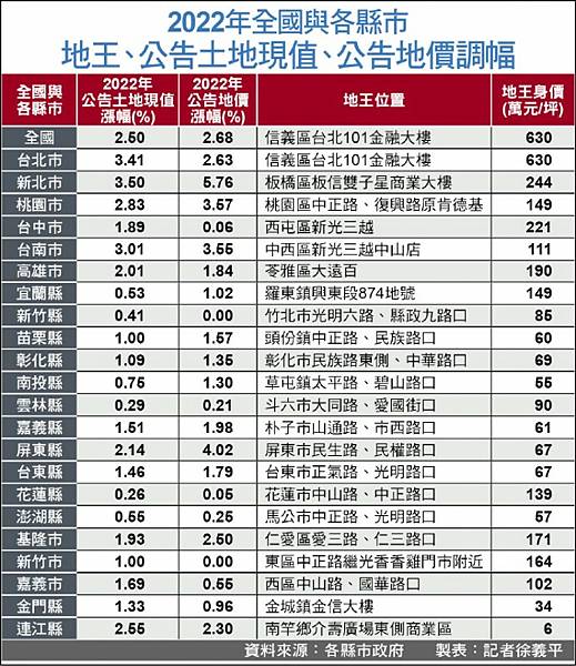 2022年全國與各縣市 地王、公告土地現值、公告地價調幅
