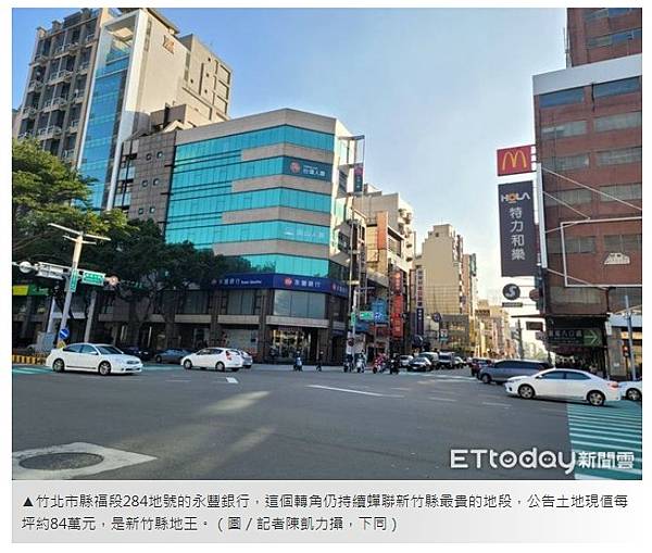 ▲竹北市縣福段284地號的永豐銀行,這個轉角仍持續蟬聯新竹縣最貴的地段,公告土地現值每坪約84萬元,是新竹縣地王。(圖/記者陳凱力攝,下同)
