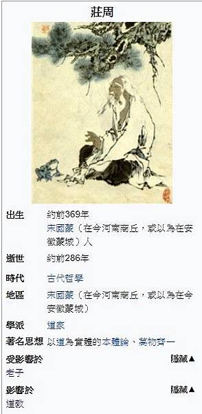 莊子(約前369年—前286年),名周,[1]生卒年失考,約與孟子同時,為戰國時代宋國蒙(河南商丘或安徽蒙城)人,曾任漆園吏。他是著名思想家、哲學家、文學家,是道家學派的代表人物,老子思想的繼承和發展者,後世將他與老子並稱為「老莊」。他也被稱為蒙吏、蒙莊和蒙叟。西元742年,唐玄宗天寶初,詔封莊周為南華真人,稱其著書《莊子》為南華經[2],在四庫全書之中歸類為子部道家類。