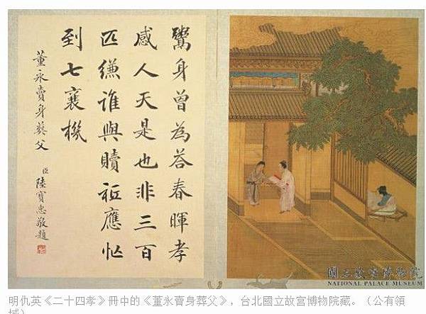 明仇英《二十四孝》冊中的《董永賣身葬父》,台北國立故宮博物院藏。(公有領域)