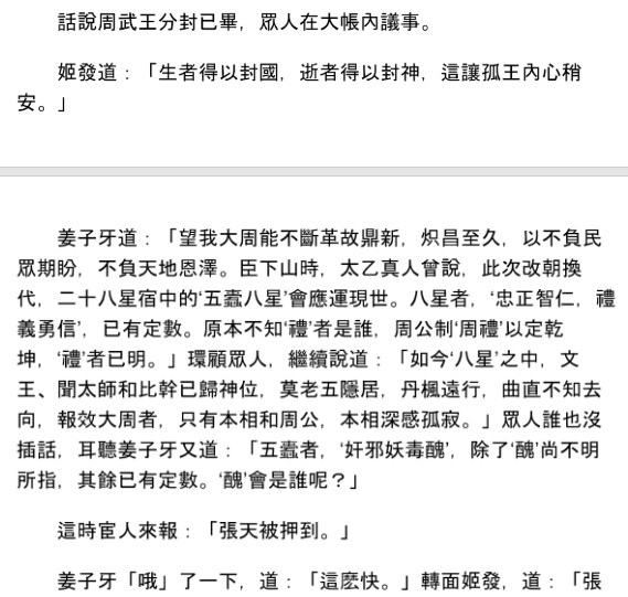 周文王問其緣故,那女人說:"我是東海泰山山神的女兒,嫁給西海龍王作妻子。我想回東海去,不料灌壇令擋了我的道。因為太公德高望重,我不敢挾暴風驟雨而過呀!"