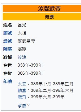 呂光以姜太公為祖先,加上廟號始祖。廟號,是中國、朝鮮半島、越南古代帝王去世後,後人在太廟之中奉祀時追尊的名號 https://goo.gl/emHnTa