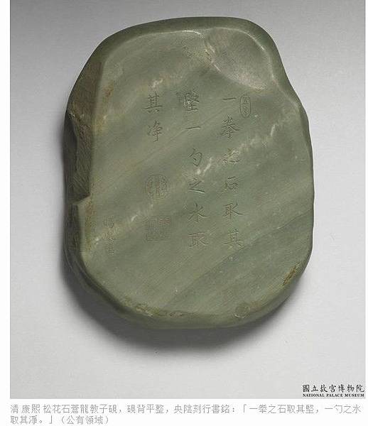 清 康熙 松花石蒼龍教子硯,硯背平整,央陰刻行書銘:「一拳之石取其堅,一勺之水取其淨。」(公有領域)