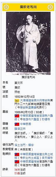 【備註】廣欽法師(1892~1986),近代高僧,貧苦孤露,宿慧萌芽,出家之後,食人之所不食,為人之所不為,常坐不臥,一心念佛,潛修百苦,卒致徹悟。法師是修行的典範,一生踐履頭陀苦行,既未高建法幢、升座講經,也無生花妙筆,但他參禪念佛、平實無奇的行持卻感動千萬眾生
