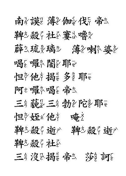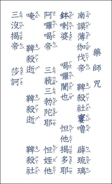 南無薄伽伐帝,鞞殺社窶嚕,薜琉璃,跋喇婆, 喝囉闍也,怛他揭多也,阿囉訶帝,三藐三勃陀耶,怛侄他,唵,鞞剎逝,鞞剎逝,鞞剎社,三慕揭帝,娑婆訶!