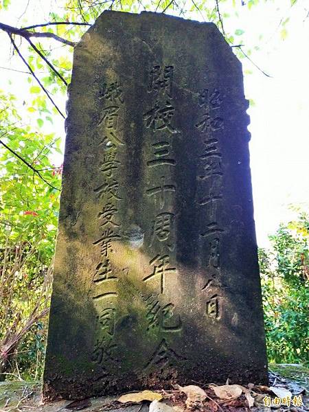 新竹縣峨眉國小開校30周年紀念碑,近半世紀前幸運地躲過政府下令清除日本殖民統治遺跡的命運,並在20年前「重見天日」,至今已有90年歷史。(記者廖雪茹攝)
