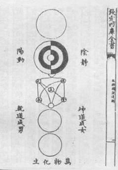 受《周易·繫辭傳》的啟發周敦頤在《太極圖說》中闡釋了其宇宙觀,「無極而生太極,太極而生陽,動極而靜。靜極復動,一動一靜,互為其根;分陰分陽,兩儀立焉。」