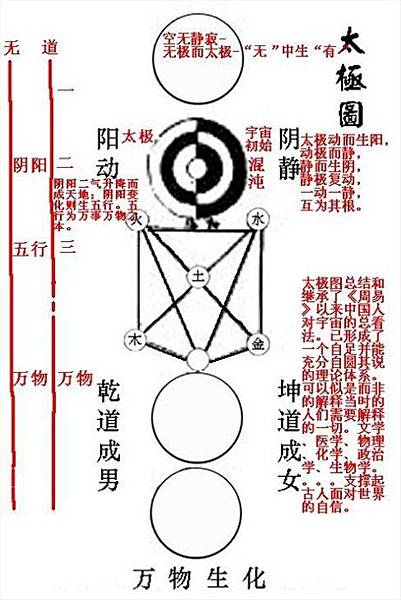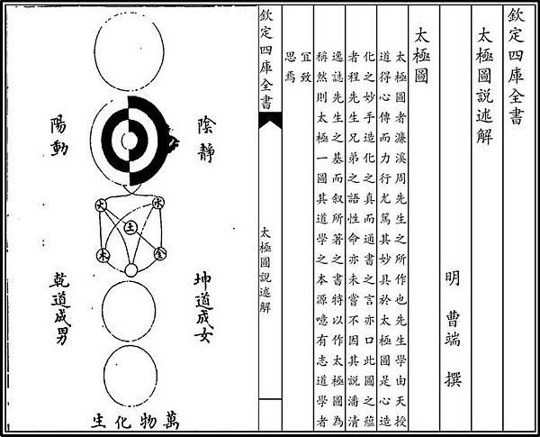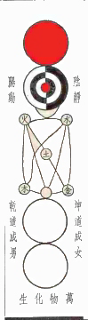 (從無極化生太極。太極運動產生陽性,動到極點,轉化為靜止;靜止產生陰性,靜到極點又重新運動。一動一靜,互相做對方的根據。分出了陰陽,天地兩儀也就確立了。陽與陰變化相交合,於是產生水、火、木、金、土。五行之氣依著順序流行佈化,四時便運行了。五行統一於陰陽;陰陽統一於太極;太極是根據於無極的。五行產生後,各有自己的性質。無極的真性,陰陽五行的精華,玄妙地結合凝聚,由乾健之性生成陽男,由坤柔之性生成陰女。陽男和陰女二氣交接感應,化生萬物,萬物生生不息,於是變化無窮了。只有人類,得到無極真性、陰陽五行的精粹,因此最是靈慧。形體一旦生成,他的神明產生了知識,生活中的萬事也就生出了。聖人定下中正仁義的原則而以靜為主張,這就確立了做人的根本準則。所以聖人的德性與天地相符,其明智與日月相合,行事的秩序與四時的推移相合,趨吉避凶,與鬼神的不測功能相合。君子照它來修身,所以總是吉利,小人違背它行事,所以不免於凶險。因此說︰確立天行的準則,叫做陰與陽;確立地處的準則,叫做柔弱與剛強;確立人事的準則叫做仁與義。又說︰推知其本始返回到最終的道理,所以能夠明白死與生的學說。偉大啊,易,這就是最高明的真理了!)