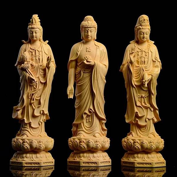 造像上,三者皆在蓮座上,蓮象徵出淤泥而不染,於一真法界而能應化在十法界;阿彌陀佛居中,觀音菩薩脅侍在左,大勢至菩薩脅侍在右。三者塑像或畫像為修行淨土宗者禮敬的對象。