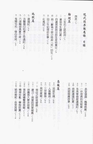 本書名為《現代因果報應錄》,緣起是在公元2001年9月26日恩師 淨空老法師,睽違台灣四年首次回台弘法。老法師與藝文界陳居士見面,提起籌拍《地藏經》故事,當時老法師特囑咐末學去搜集近代(公元1911年)以後所發生因果報應故事。因末學於幾年前,拜讀唐湘清居士所編《因果報應錄》時,便發願將來有因緣,希望能編一本與現代人相關因果故事。因末學平素就有閱讀各種因果書籍及剪報資料。故於老法師離台前,便及時完成87篇《現代因果報應錄》,敬呈老法師帶回新加坡,交予善心人士以簡體字版流通。結果因緣如此巧合,此書千里迢迢又回到台灣,由陳宜蔚居士發心倡印,大量流通。並由末學再補錄13篇,合計100篇成為增訂版(當然以後還會陸續補錄)。本書分成輪迴篇、地獄篇、惡報篇、善報篇。內容著重在殺生、邪淫報應,因眾生習氣最容易犯為殺淫二業,《楞嚴經》云:“是修行人,若不斷淫,及與殺生、出三界者,無有是處。”殺、淫是輪迴因果之根源。祝福本書流通,能消弭刀兵劫災禍,於當今五濁惡世,不信因果輪迴、邪正不分、道德沈淪、逆倫事件不斷發生,殺淫惡業充塞世間,人心趨向乖戾,冀望本書能發揮振聾發聵、激濁揚清之警世教化作用。祈願人人知因識果,懺悔業障,斷惡改過修善、社會祥和安樂,天下無災無難,念佛求生淨土,是以為序。