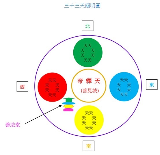 此天爲欲界天第二層天,位於須彌山頂上,四面各為八萬由旬,山頂之四隅各有一峰,高五百由旬,由金剛手藥叉神守護此天。中央之宮殿名為善見城,是帝釋天所住,城外周圍有四苑,是諸天眾遊樂之處。城之東北有圓生樹,花開妙香薰遠,城之西南有善法堂,諸天眾群聚於此,評論法理。四方各有八城,加中央一城,合為三十三天城,故名三十三天。[1]